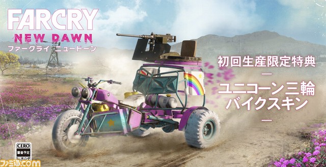 PS4版の初回生産限定特典は、極彩色に包まれたホープカウンティにふさわしい、サイケデリックな配色の“三輪バイク”ユニコーンスキンのプロダクトコード。