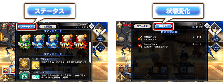 在战斗中,玩家可以在“英灵详细”一栏中确认目前所装备的Command Code的具体信息。除此以外,还单独增加了“状态变化”的标签供玩家预览当前生效中的BUFF和DEBUFF。