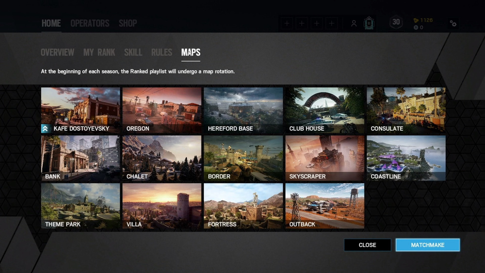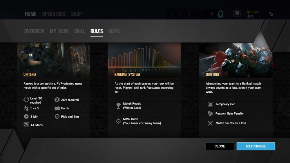 左图:排位赛的资格和规则,要求等级30级,账号进行二步验证,5v5,仅有炸弹模式,每回合比赛时间为3分钟,实装Pick & Ban系统(在开局之前可以轮流禁用对方的两位进攻干员和防守干员),排位地图池有14张地图。