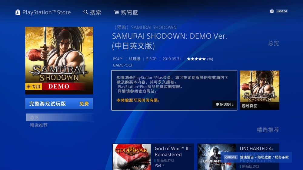 近日,SNK 在 PS4 发布了其旗下刀剑格斗新作《侍魂 晓》(SAMURAI SHODOWN)的免费试玩 DEMO ,即日起 PlayStation Plus 会员可在商店中搜索 SAMURAI SHODOWN 即可下载试玩版,试玩版中玩家可以以内鞍马夜叉丸、霸王丸以及娜可露露三位角色在包括对抗及教学在内多个模式游玩2小时;需要注意的是,DEMO 在6月20时日之后 就将无法游玩,想要游玩的玩家也不要错过这个好机会了。