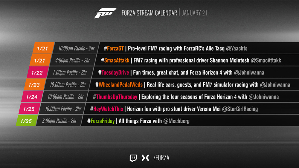 以下是 Forza Mixer 和 Twitch 频道下周的节目安排:
