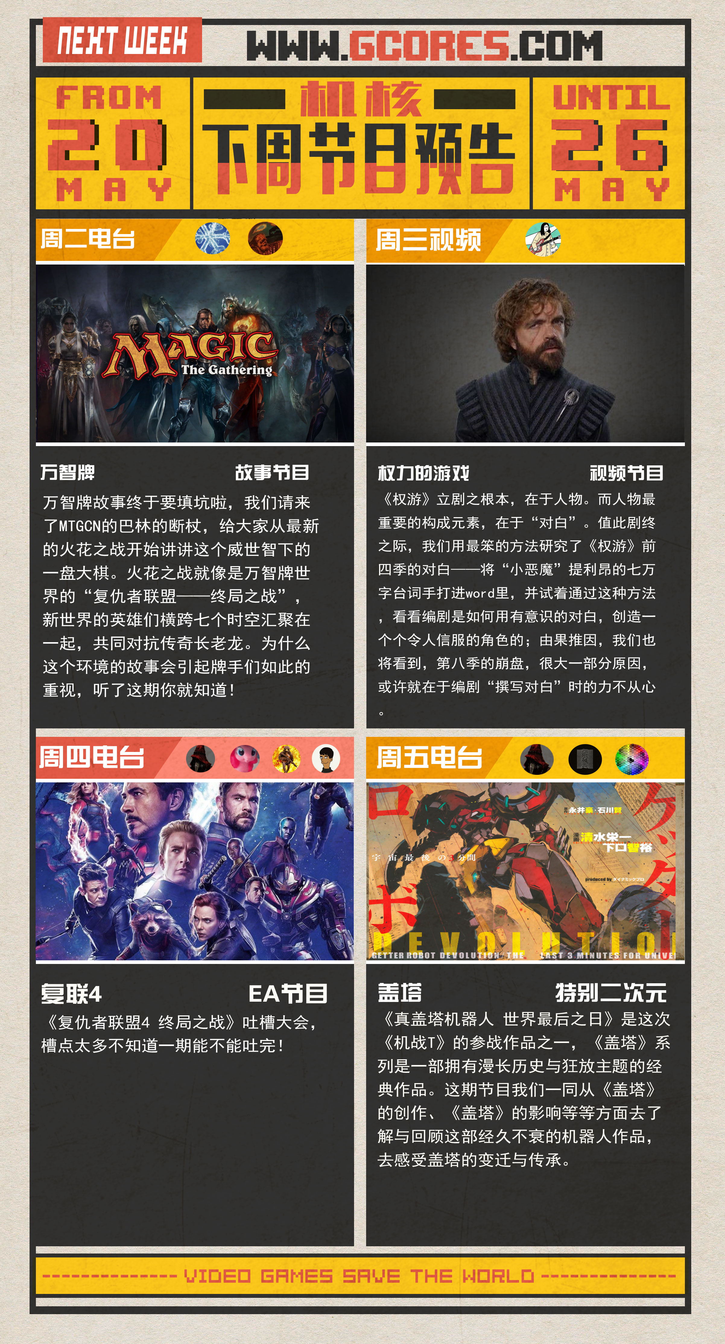 下周节目预告5.20~5.26 Gcores 2019年05月17日 20:21 favorite report share 大家好!下周节目如图所示!《权游》在下周会迎来大结局,而我们的开姐也在这个时候会奉上准备已久的大制作!另外下周二次元新闻和游戏新闻都会恢复更新,本周也会有游戏新闻的更新,祝大家周末愉快! User name Letters only eMail eMail only closeclear comment Join the discussion sendadd comment Nothing here~ arrow_back Prev Article Rand Article Next Article arrow_forward 2019《英雄联盟》季中冠军赛半决赛:TL率先进军决赛