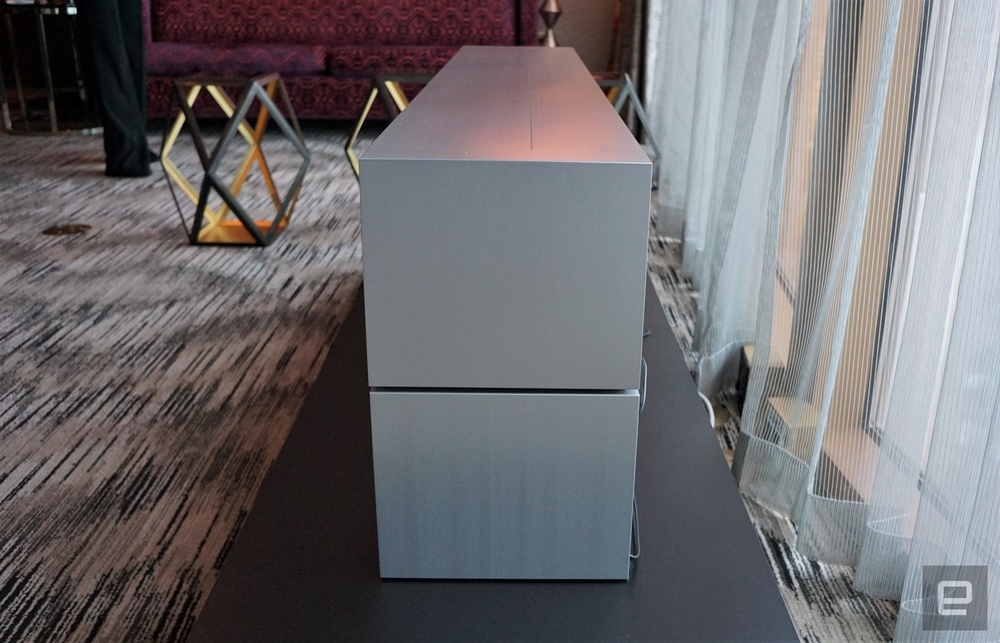 从外观上来看,电视的本体像是一个音响,正面的面板也确实是声音输出的地方,而 OLED 则隐藏在盒子里,只有在开启的时候才会伸展出来,整个过程充满了未来感。