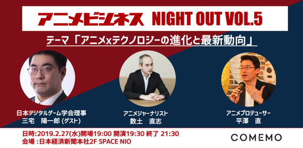 「COMEMO x アニメビジネス vol.5」は2019年2月27日、日本経済新聞社の東京本社ビルにて開催。参加費は5,000円で、過去のセッション(vol.1,2,3,4)いずれかに参加していれば3,500円で聴講できる。募集人数は先着80名で、WEB上で参加申し込みを受付中だ。