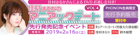 また、イベントを記念してニコニコ生放送「佳村はるかのマニアックデート特番」を2018年12月11日(火)20:30から90分行います。DVDの振り返りトークや、イベントの物販で行うGOODSの公開準備等、見どころ盛りだくさんのニコ生を予定しております。