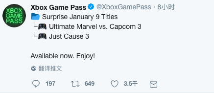 Xbox Game Pass 官方推特今天确认,《正当防卫3》与《漫威对卡普空3 终极版》正式加入 Xbox One 的 Xbox Game Pass 阵容,同时也表示这也只是1月份惊喜9连中的其中一部分而已。