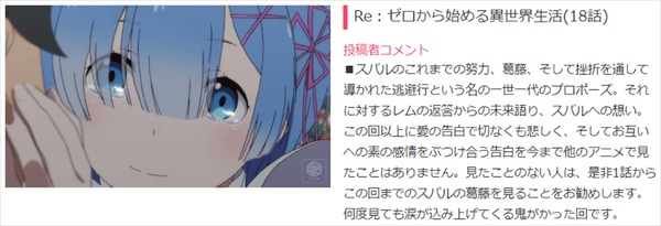 『Re:ゼロから始める異世界生活』18話には、「この回以上に愛の告白で切なくも悲しく、そしてお互いへの素の感情をぶつけ合う告白を今まで他のアニメで見たことはありません」と心を揺さぶられた視聴者がいたほか、「レムのひたむきな愛は報われなかったが、今までのアニメ界No.1の告白シーンでした」と評する声が。