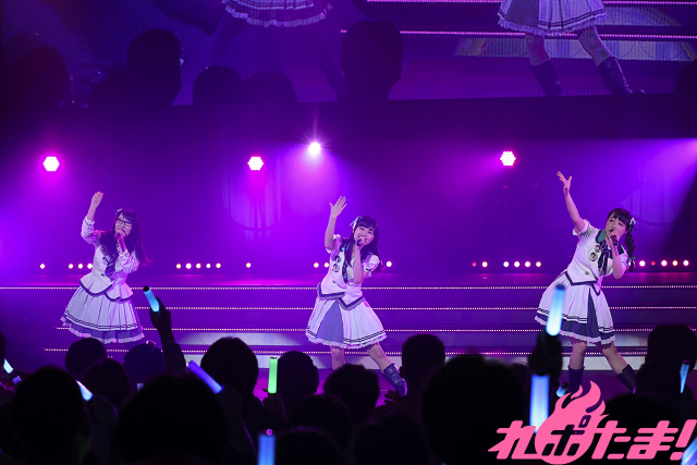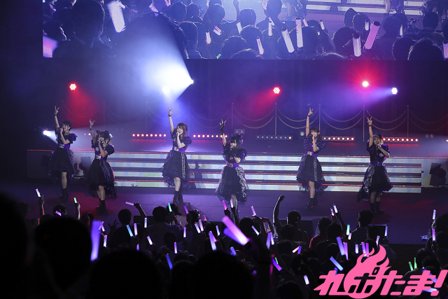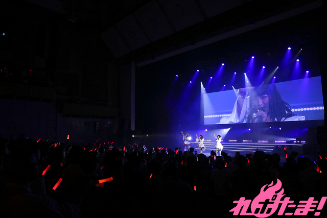 SPRiNGSのグループ内ユニット・SPiCAの「おはようジャポニカ」を挟み、こちらもライブステージ初登場のAdhara。この日は花巻吹歌役の飯田里穂さんが不在だったが、MCでは田中さんが「今日は彼女の分まで頑張ります!」と気合いも十分。紫と黒のコントラストが映えるドレス姿で「イプシロン進化論」、「孤高のピエロ」を披露した。