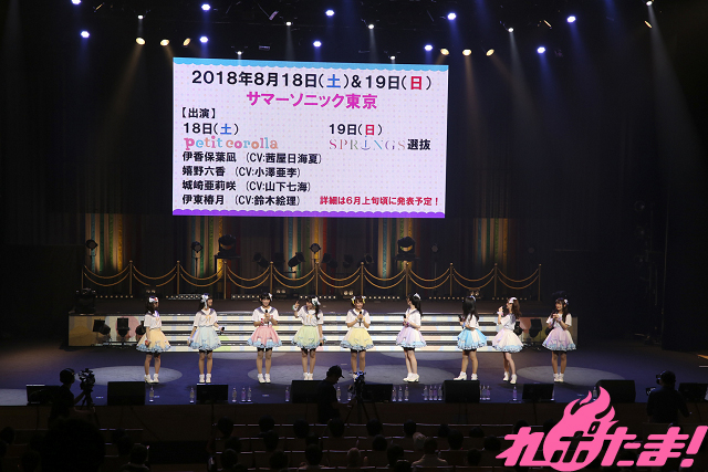 アンコールでは新情報が続々と公開。イベント関連では既報の6月2日(土)開催「芦ノ湖遊覧船の貸切イベント&公開収録」に加え、8月5日(土)に北海道・札幌でイベント(新曲を初披露する予定)、さらに9月30日(日)は愛媛・松山でのイベントと、8月18日(土)、19日(日)に開催される「サマーソニック2018」に参戦することが発表され、petit corolla(伊香保葉凪(CV:茜屋日海夏)、 嬉野六香(CV:小澤亜李)、城崎亜莉咲(CV:山下七海)、伊東椿月(CV:鈴木絵理))が初のステージに立つことも明かされた。