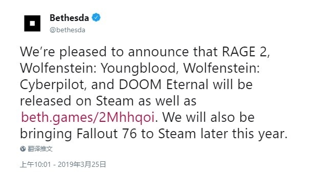 贝塞斯达于近日证实,其即将推出的一批IP游戏如《重返德军总部》和《毁灭战士》等都将在 Steam 上发布。贝塞斯达确认《狂怒2 》,《重返德军总部:新血液》,《重返德军总部:网络领航员》,以及《毁灭战士:永恒》将同时在 Steam 和 Bethesda Launcher 上发售,同时贝塞斯达表示《辐射76》将于今年加入Steam。
