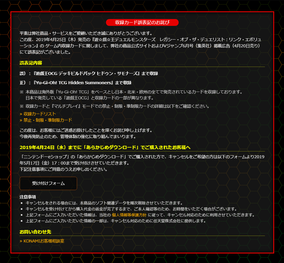 最近官网补充了一条退款信息,只要是在2019年4月24日前购买《游戏王:决斗者遗产 链接进化》的玩家都可申请退款,退款后该作的数据会被消除。不过点进申请页面后我们就能发现:该退款服务仅支持日本各银行的账户。