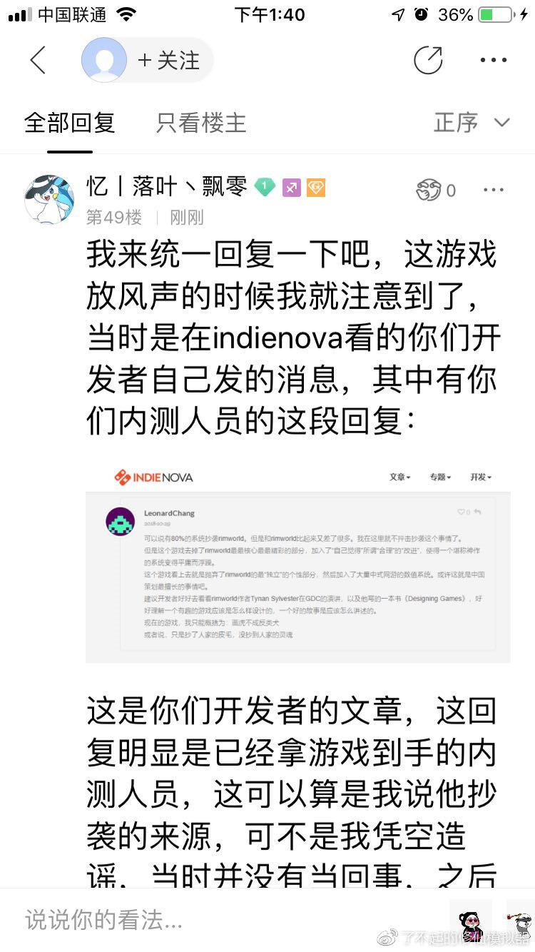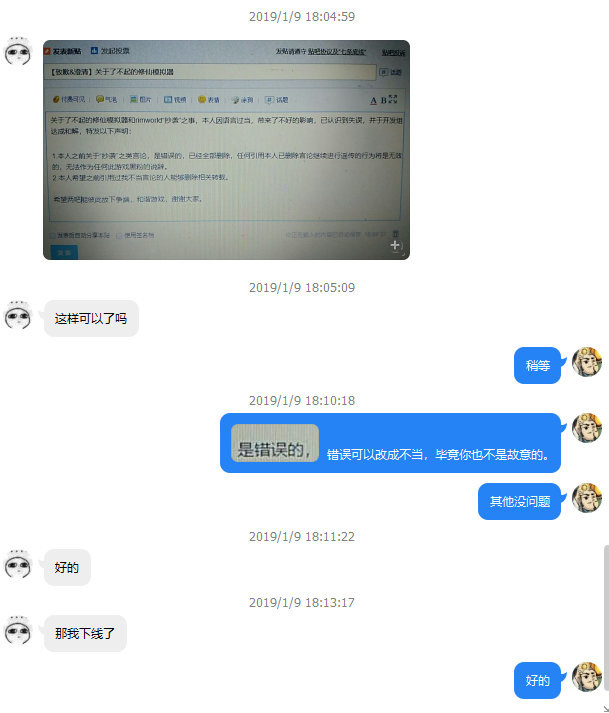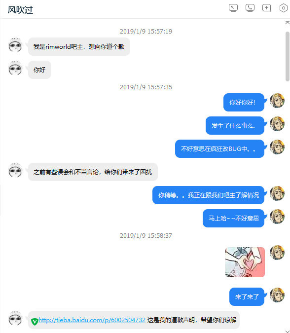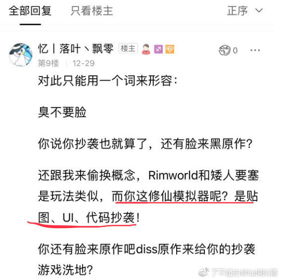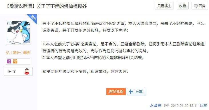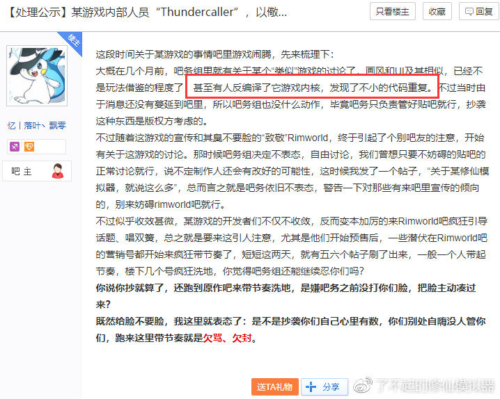 1月9日,了不起的修仙模拟器吧一个吧友发起了这个质疑贴,帖中要求rimworld吧主给出确凿证据。否则就需要对造谣进行道歉。于是这位吧主迫于压力给出了“证据”: