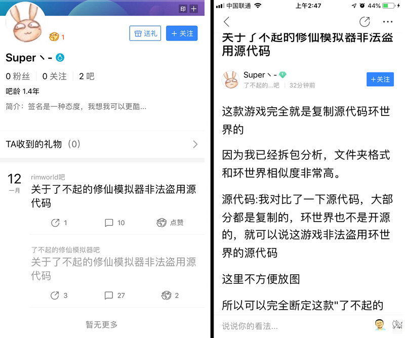 凌晨三点左右,网上各个地方同时出现“关于了不起的修仙模拟器非法盗用源代码”的帖子。