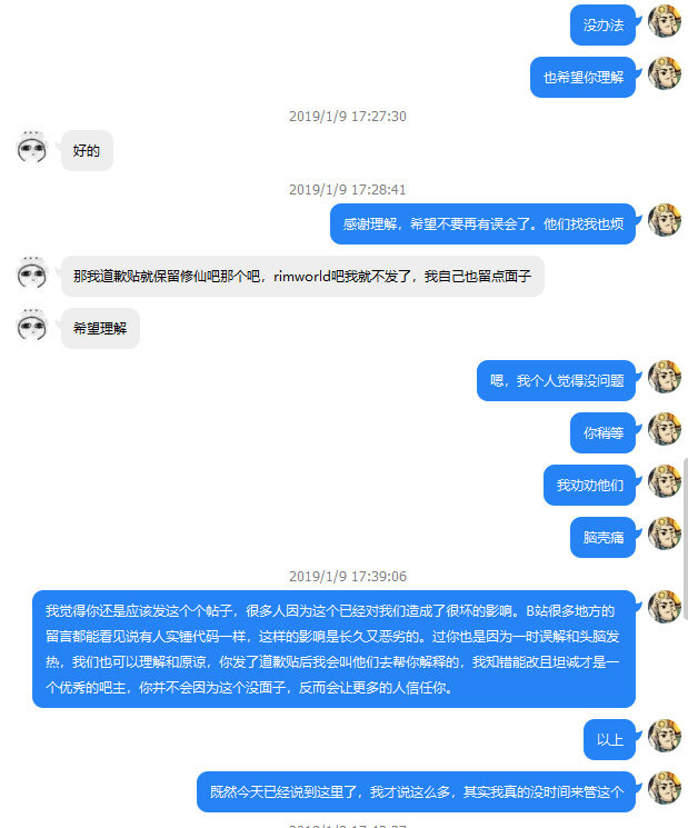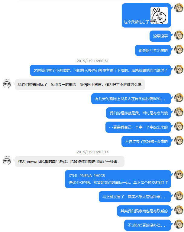 至于在rimworld吧的声明,他表示要先联系开发组。于是当天下午他找到我这里。以下是我们的聊天记录: