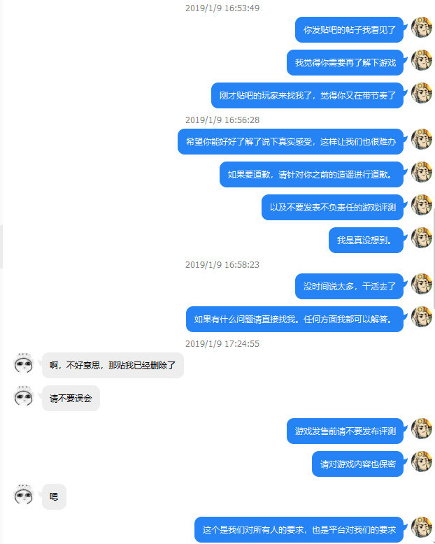部分吧友认为道歉贴中,“操作方法其实更像网易的大话西游之类的网游”等表述存在误导,之后有吧友向我反馈,我只能再次与吧主沟通: