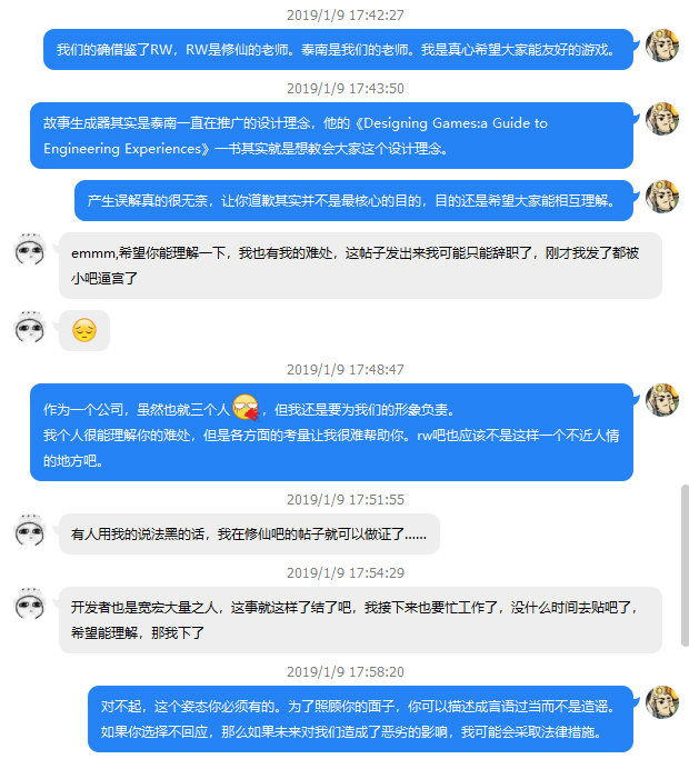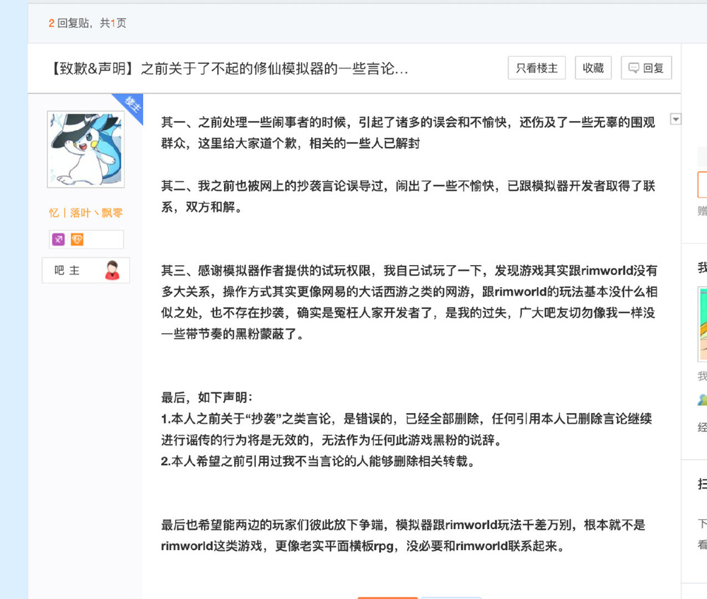 实际上当时没有开始内测,所以也没有所谓的内测人员,该玩家并未提到代码抄袭的问题。毫无疑问他对于代码相同的描述是没有任何依据和理由的,完全是个人揣测。为此在众吧友的要求下他在了不起的修仙模拟器贴吧发表了道歉声明: