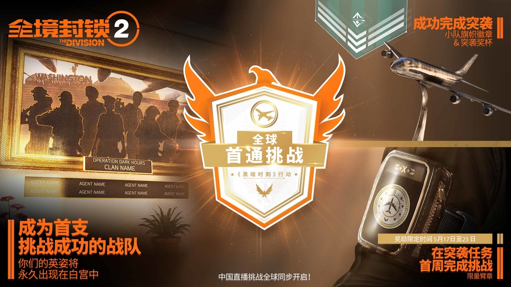 通过“黑暗时刻行动”,各位特工将夺回华盛顿国家机场并从中获得独有的战利品,其中将包括全新的套装与奇异武器和其他独家奖励。更重要的则是,《全境封锁 2》将在活动上线时同步开启全球“首杀”竞赛。首个通关的队伍将被永久铭记于白宫墙上,所有玩家都将一同见证。