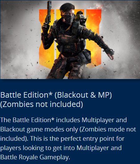 之前,《使命召唤:黑色行动4》在PC平台推出了只能玩多人对战和Blackout、不包含僵尸模式的“战斗版”游戏,定价40美元,相比标准版便宜了20美元。Blackout模式的运营周期显然会比此前的使命召唤长不少,不知道未来动视还会给本作哪些“特殊对待”。