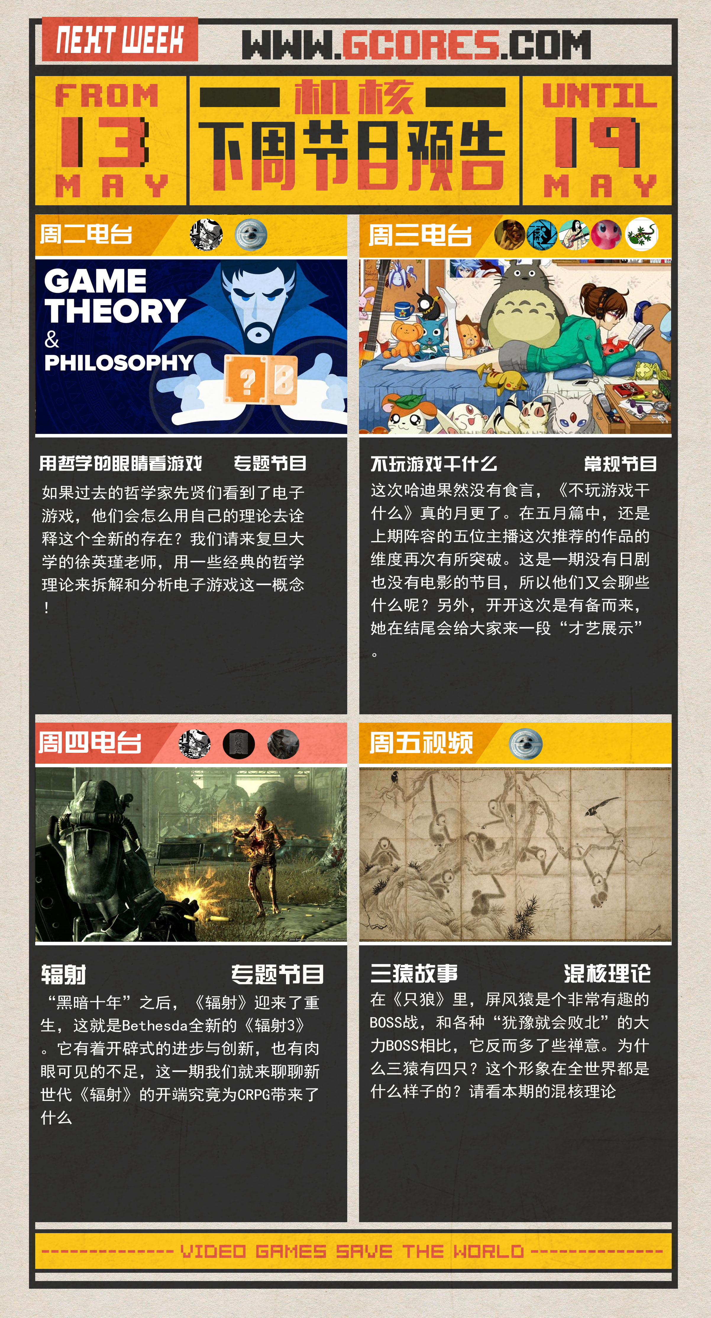 下周节目预告5.13~5.19 Gcores 2019年05月10日 15:46 favorite report share 大家好!下周节目如图所示,虽然周末就是核聚变了,但我们还是为下周准备了很多内容。许久没更新的混核理论又将推出全新的一期,而其他也有常规节目和专题节目的稳定更新,大家各取所需!下周没有二次元新闻节目,而游戏新闻应该会更新,祝大家周末愉快 User name Letters only eMail eMail only closeclear comment Join the discussion sendadd comment Nothing here~ arrow_back Prev Article Rand Article Next Article arrow_forward 里高野的孔雀离开了人间:漫画家荻野真去世