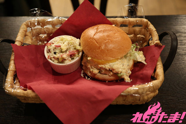 緑爪族のザリュースがみんなに広めた魚の養殖技術で生産した魚をハンバーガーにしました! こんがり焼いた鯖にタルタルソースと丸まる一枚のレモンを合わせサッパリとした味わいに。コールスローとの相性も抜群!