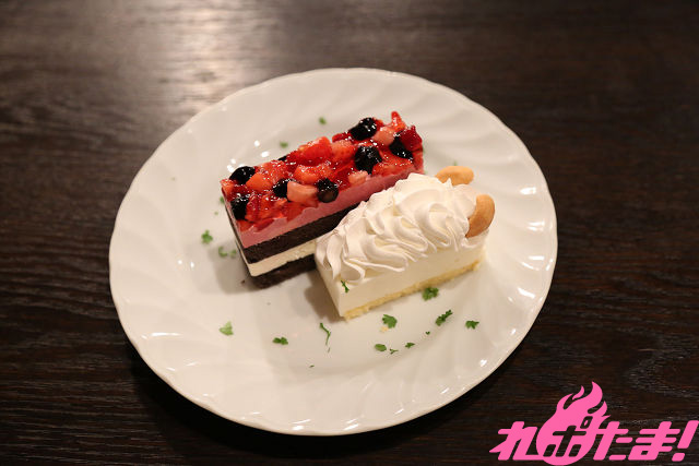 恋のライバル(?)であるアルベドをイメージしたレアチーズケーキとシャルティアをイメージしたいちごとベリーのケーキのセット。