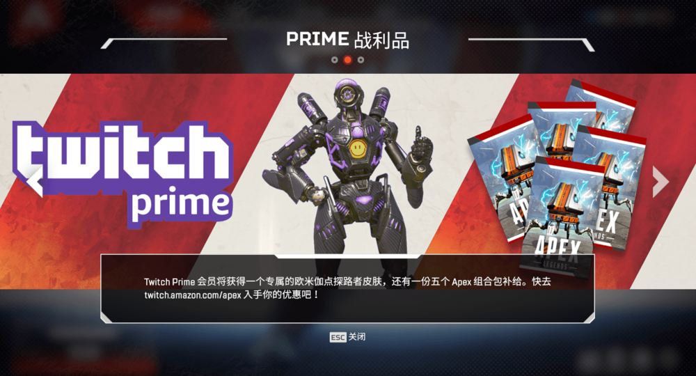 领取方式以及注意事项可以参看:《Apex 英雄》加入Twitch Prime,玩家可得限定皮肤。