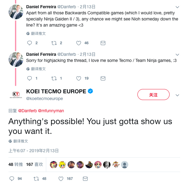 随后呢,玩家 Daniel Ferreira 则是在下面评论表示,他是真的希望有朝一日能看到《忍者龙剑传2》和《忍者龙剑传3》能在 Xbox One 上向下兼容,另外也希望能在 Xbox One 上玩到像《仁王》这种优秀的作品,而《仁王》初代目前还是 PS4 独占,《仁王2》在2018年的索尼 E3 展前发布会上公开。