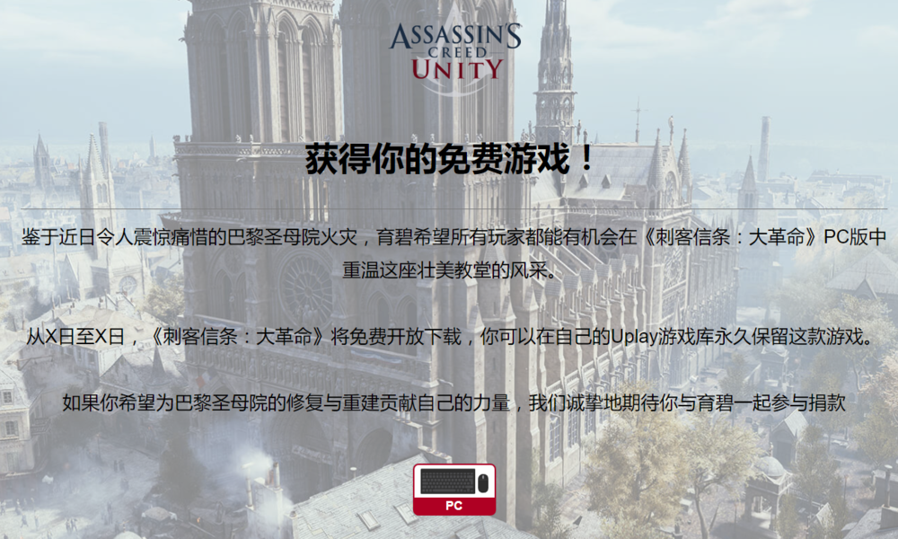 数十分钟前,育碧官方宣布鉴于周一巴黎圣母院的火灾令人痛心,他们希望所有玩家都能够有机会在《刺客信条:大革命》的PC版中重温这座壮美教堂的风采——在4月17日-4月24日期间,该游戏将会在Uplay免费开放下载,所有玩家可以领取游戏并永久保存在自己的游戏库中。