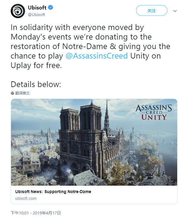 火灾一出,各界纷纷解囊相助。育碧将出资50万欧元来协助巴黎圣母院的重建工作。他们在《刺客信条:大革命》中用了两年时间重现了巴黎圣母院,这将对巴黎圣母院的重建工作大有裨益。