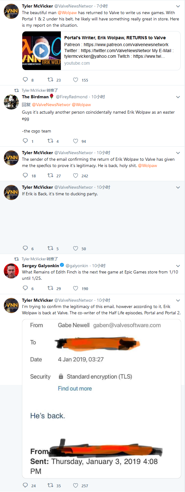 继《传送门2》的编剧之一,杰·平克顿(Jay Pinkerton)从Valve离职后又返回后,《传送门2》的主编剧艾里克·沃保(Erik Wolpaw)也回到了Valve,并且得到了Gaben的确认,在最近的一张与Gaben间的电子邮件来往截图中,Gaben被问到艾里克回到了V社没,Gaben给出了肯定的答复。