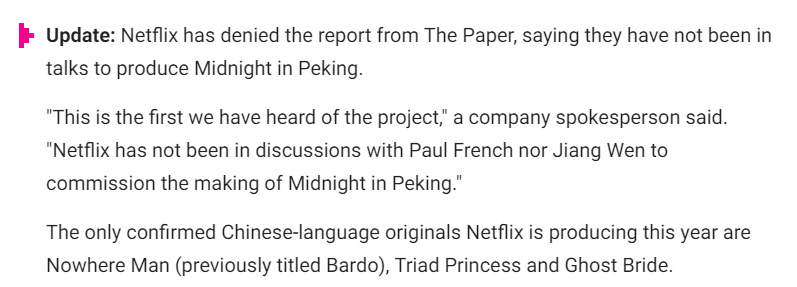 原文来源:Netflix denies reports of Midnight in Peking murder mystery show (updated)