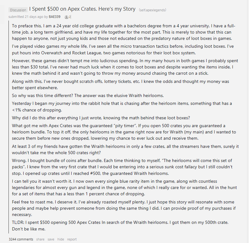 BAE339,24岁,是大学毕业生。他已经工作了,业余时间经常玩电子游戏,已经见过各种形式的微交易,并很少氪金,但这次在《Apex 英雄》中遭了殃。他的很多朋友都出货了传家宝,官网又写明了开500个箱子保证出传家宝,因此 BAE339 产生了侥幸心理:”我应该不会花500个箱子才出。“结果事与愿违,他又不肯收手。机械式的重复充值,氪金,开包。等最后出了时候却一点高兴不起来,感觉一切都是非理性的浪费。