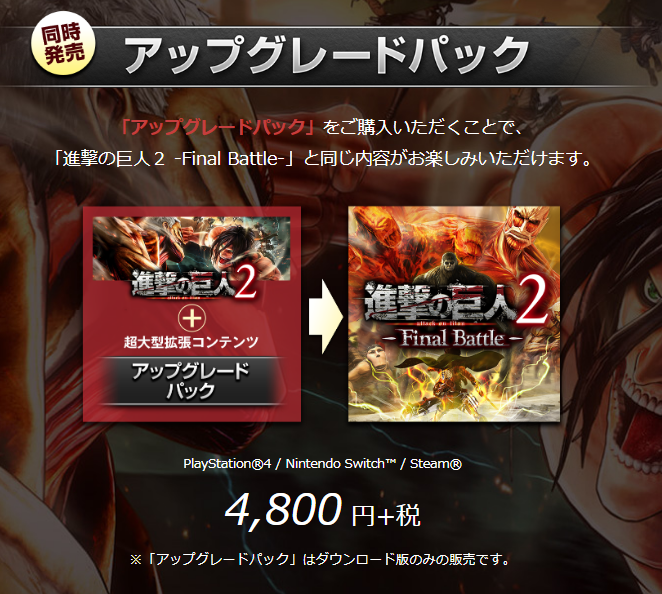 如果玩家拥有《进击的巨人2》的话也可以通过购买售价4800日元的升级包来将游戏升级成为《进击的巨人2 -Final Battle-》。