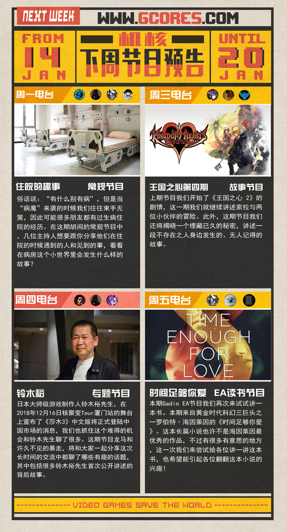 下周节目预告1.14~1.20 Gcores 2019年01月11日 18:28 favorite report share 大家好,下周节目如图所示,常规、故事、专题、EA……电台所有节目的类型挨着来个遍,当然周末还有稳定更新的新闻节目。 祝大家周末愉快! User name Letters only eMail eMail only closeclear comment Join the discussion sendadd comment Nothing here~ arrow_back Prev Article Rand Article Next Article arrow_forward KT 又公布一支《死或生6》角色预告,女天狗和 Phase-4 齐登场