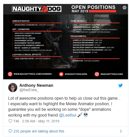 此前,顽皮狗副总裁 Neil Druckmann 在推特表示《最后生还者 第二章》已拍摄完毕,而这意味着游戏的所有场景的动作捕捉都已结束。而现在联合导演 Anthony Newman 也表示希望招聘一批优秀的开发者,帮助他们完成游戏的收尾工作。