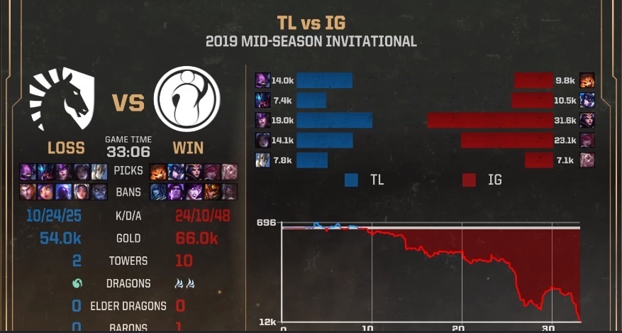 第四局,TL 几乎全程都领先于 IG, TL 放出大招选到拉克丝中单,而 IG 选到了一套偏保护的体系。比赛的前期,TL 野辅打得非常优秀,连续的带节奏快速的将 IG 节奏压制,帮助队伍抑制住 IG 中下的发育,TL 顺利建立起前期领先。比赛的中期, TL 给 IG 带来了巨大的压力,利用阵容优势抢占野区视野,随后顺利拿下大龙将前来接战的 IG 团灭,进一步的扩大经济领先。随后,TL完全没有给 IG 任何机会,再度拿下大龙将 IG 三路摧毁后,压进一波结束比赛,很遗憾IG将告别本次MSI的赛场,也再次恭喜 TL 拿到了进军决赛的门票。