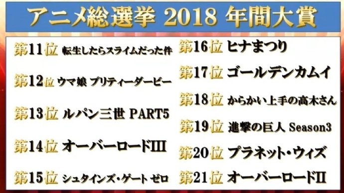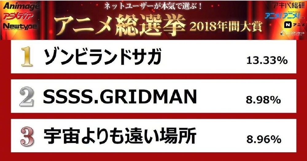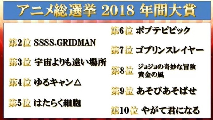 就在今天晚上由NICONICO主办,アニメージュ、アニメディア、Newtype、アキバ総研、アニメ!アニメ!协力举办的动画总选举2018年间大赏开始了正式投票,投票时间为18:00-22:00,总共从2018冬季、春季、夏季以及秋季秋季排名中的20个作品以及“不死鳥枠”作品共计21个作品中投票产生。