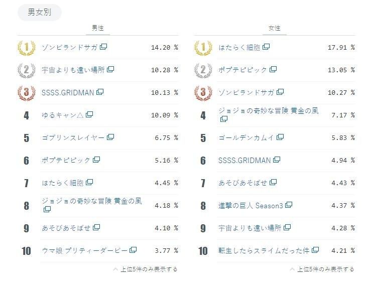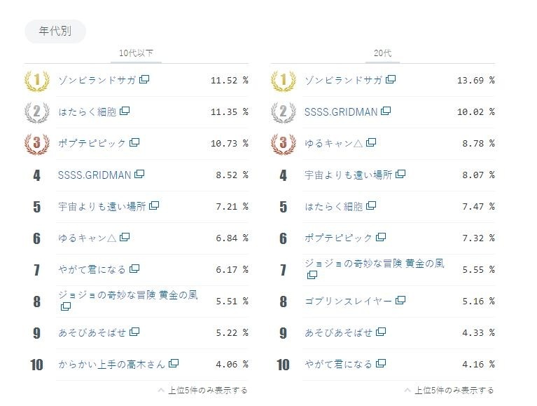 在今年的投票结果中,僵尸题材偶像动画《佐贺偶像是传奇》稳稳的拿下了第一名,在开播之前这部动画并不被所有人看好,但是该动画凭借着其出色的剧情与僵尸与偶像题材的巧妙搭配,成功拿下了在不久之前举行的2018年秋动画总选举,其圆盘销量一度登顶日亚,更是在第一周拿到了接近2W销量的好成绩,不得不说这部动画是18年最出人意料的一匹黑马。该动画在国内由A站独播,目前因不知名的原因还在下架中,希望能够早日恢复重新上线。