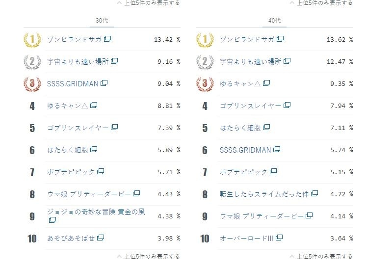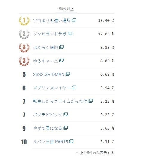 第二名则是由《SSSS.GRIDMAN》获得,这部动画在上线之前便受到关注,该动画刚播放不久便产生了大量六花与茜的图,同时其充满特摄风味的战斗与稳扎稳打的剧情更是博得了广大网民的喜爱,除了结尾目前有较小的争议之外可以说GRIDMAN获得第二名是毫无争议的。