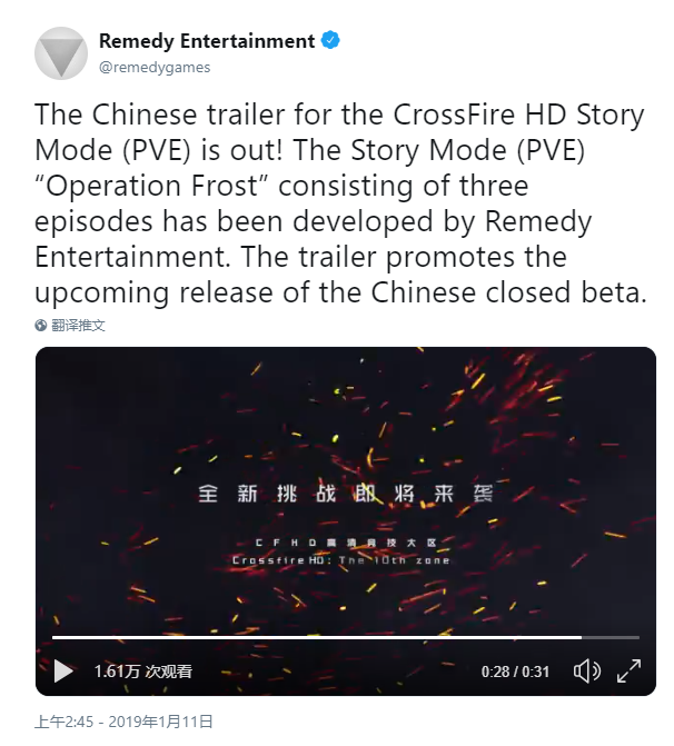 近日,Remedy Entertainmet工作室的官方推特今天发布了一段《穿越火线HD》“代号:暴风雪(Operation Frost)”的剧情模式(PVE)的预告,视频中为玩家展示了一场在暴风雪中进行的突击行动,据悉本模式包含的三个章节全部交给了Remedy Entertainmet制作。
