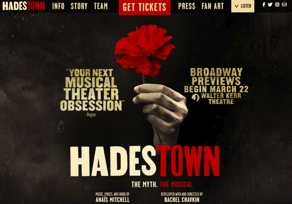 《Hadestown》将于 2019 年 3 月上演,改变自古希腊俄耳甫斯(Orpheus) 和欧律狄克(Eurydice) 之间发生的神话故事。在神话故事中,俄耳甫斯为拯救爱人,毅然踏上前往冥府的道路。在新的改编版歌剧中,对于伟达爱情的描写是其中的重点,感兴趣的朋友可以在其官网上了解一下。