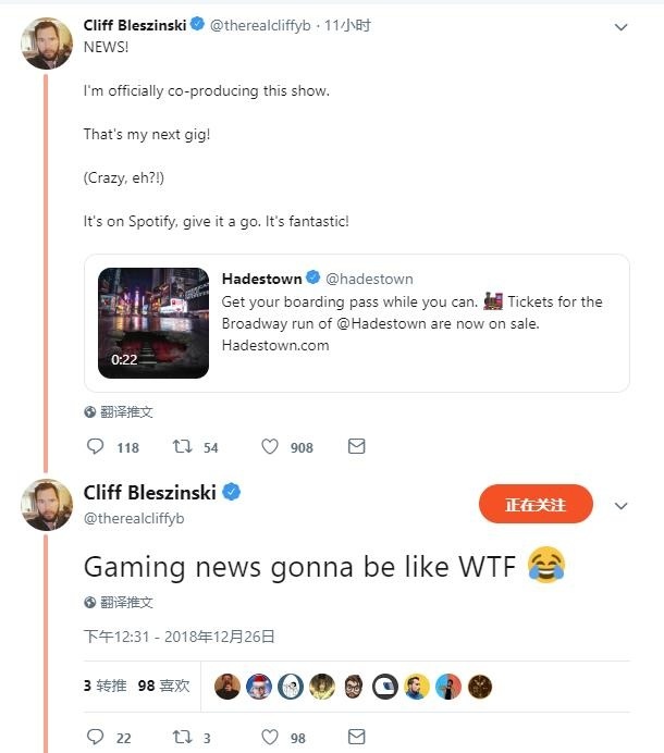 Cliff Bleszinski 在他的推特上宣布,将参与百老汇歌剧《Hadestown》的联合制作。同时,他也十分明白这条消息对于各大游戏媒体来说,都是一条“WTF”的存在。游戏制作人的跨界合作并不少见,但这么“文艺”的还真不多。Cliff 也自己解释到,他一直很喜欢歌剧,这也是圆了他的一个梦。