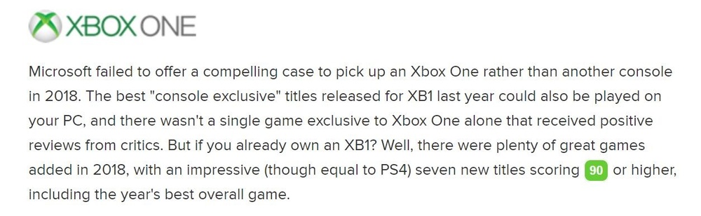 Metacritic认为,Xbox One没有任何积极评价(80分及以上)的真独家游戏(there were no positively reviewed true Xbox One exclusives released in 2018)。
