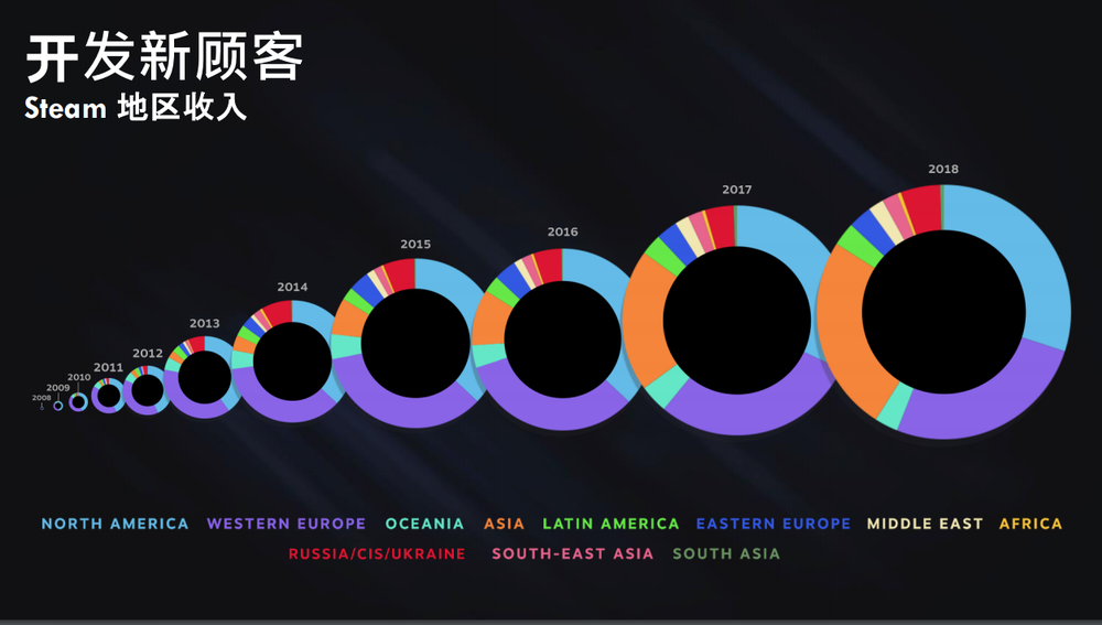 尽管面对包括 Epic 在内的平台的竞争,Steam 在近期的表现可以说是十分喜人的——要知道,在一年前 Steam 的月活跃用户还是6700万,而这一喜人的表现也和亚洲(尤其是中国市场)离不开关系,随着《绝地求生》等游戏的火热以及正版意识的增强,Steam 的亚洲玩家群体规模已经与美国和西欧玩家相当。
