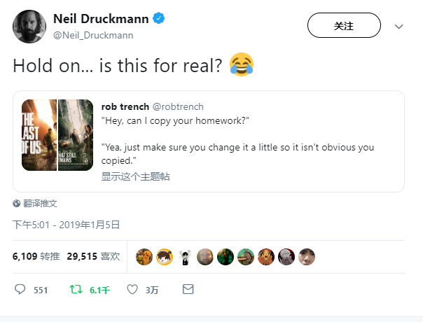 而顽皮狗游戏的副总裁,《最后生还者》和《最后生还者:第二章》(The Last of Us: Part Ⅱ)》游戏总监Neil Druckmann,转发了该推特,并评论到:“等会....这是真的吗?”并配上了笑哭的颜表情