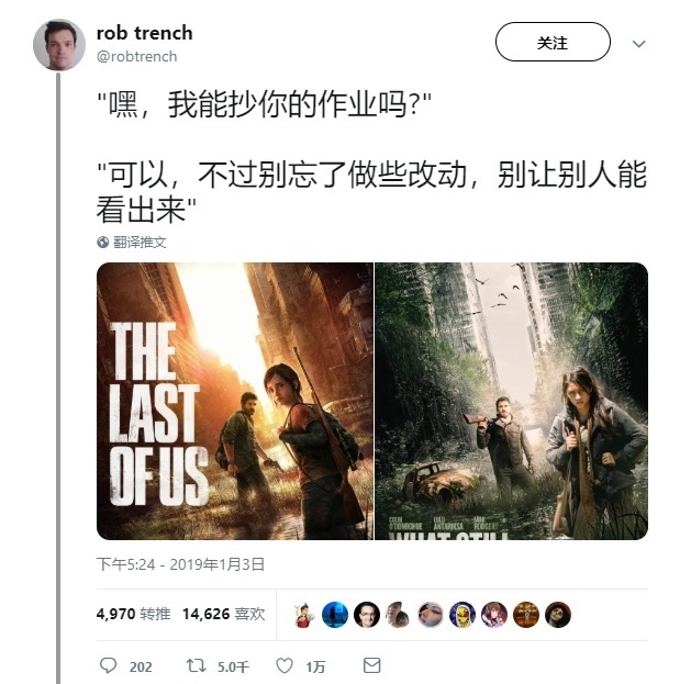 近期,该电影因海报涉嫌抄袭《最后生还者》而遭到了推特网友rob trench的质疑,如图可见海报的各个元素都有很高的相似度,包括人物的位置以及背景还有左侧的车辆,有评论表示反转和加上黄昏滤镜后甚至以为是《最后生还者》真人版呢。