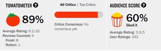 目前其烂番茄评委评分为89%新鲜,均分6.2分,观众评分为60%,均分为3.3分,而imdb评分为4.8分。