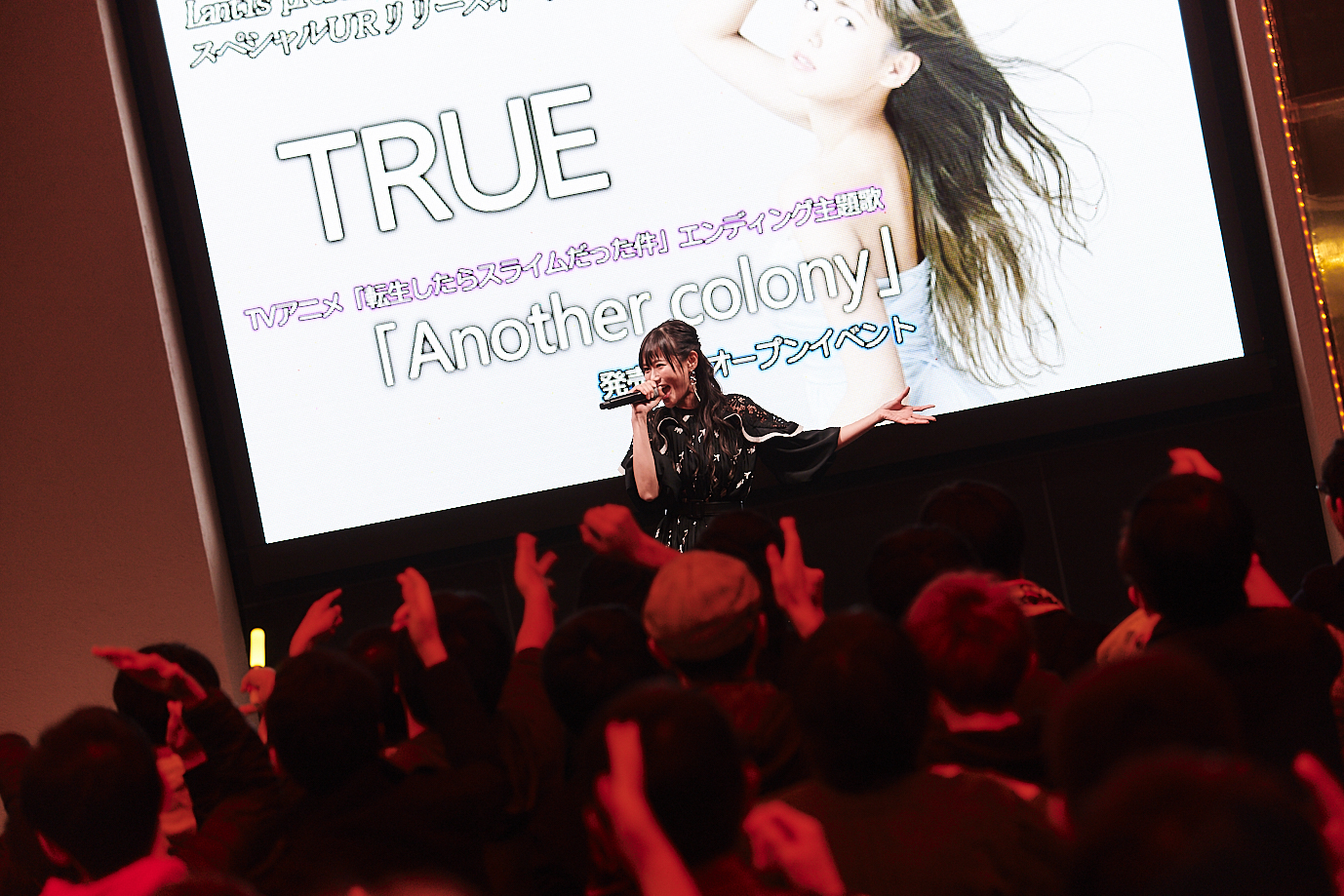 TRUEはそんな客席を優しい眼差しで見渡しながら、「『転生したらスライムだった件』のアニメを見ているよって方、いらっしゃいますか?」と問いかける。『転スラ』は先日イベントのために訪れたニューヨークでも人気だったそうで、作品とあわせて、改めてリリースされたばかりのニューシングル『Another colony』を紹介した。トークの途中、ステージの正面を走り抜けるジェットコースターを目で追いかけ、その轟音に負けないように声を張るというかわいらしい一面も。
