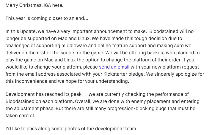 游戏制作人五十岚孝司近日通过 Kickstarter 的更新日志向众筹玩家们同步了《血污 夜之仪式》的最新消息,然而这次同步的内容可能不是什么好消息,他个人宣布本作将不再支持 Mac 和 Linux 操作系统,对众筹支持本作的玩家们表示歉意。