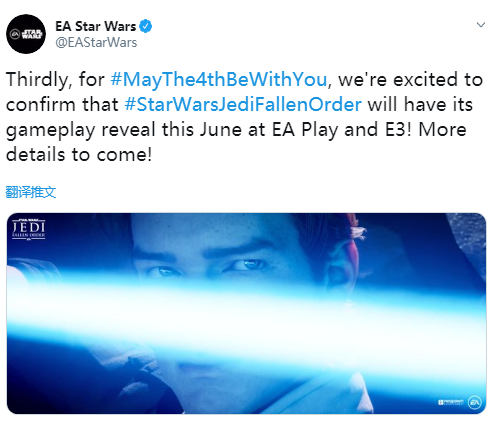 今天是地球另一边的5月4日,也是广大星战粉丝的“原力日”。EA Star Wars 官方推特宣布《Star Wars Jedi:Fallen Order》将在 EA Play、E3 上公布游戏演示。对于期待本作的玩家而言这无疑是个好消息。